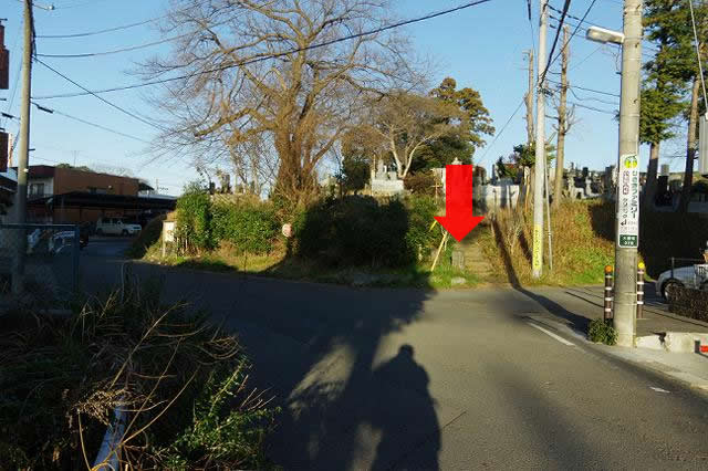 坂道を登り切ったところで1.5車線幅の松戸市道と突き当たり、9尺道の終わりとなる。こちら側には例の看板は見あたらない。