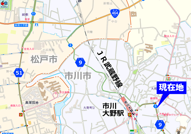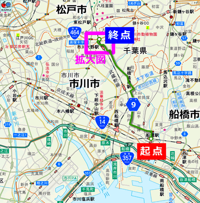 市川市の都市計画道路計画を見ると、現道の東側に平行して全幅22mの都市計画道路3.3.9号線が計画されている。これがやがて完成すれば、国道464号の交差点以南は、県道9号になるのかもしれない。