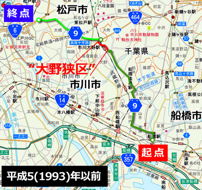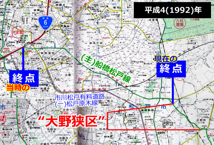 右図は、平成4(1992)年に発行された道路地図帳(千葉県広域道路地図(東京人文社))であるが、この通り、当時の主要地方道船橋松戸線の終点は現在の場所ではなく、遙かに松戸市の中心部に近い松戸市松戸にあった。泣く子も黙る国道6号【松戸隧道交差点】 が、終点だった!