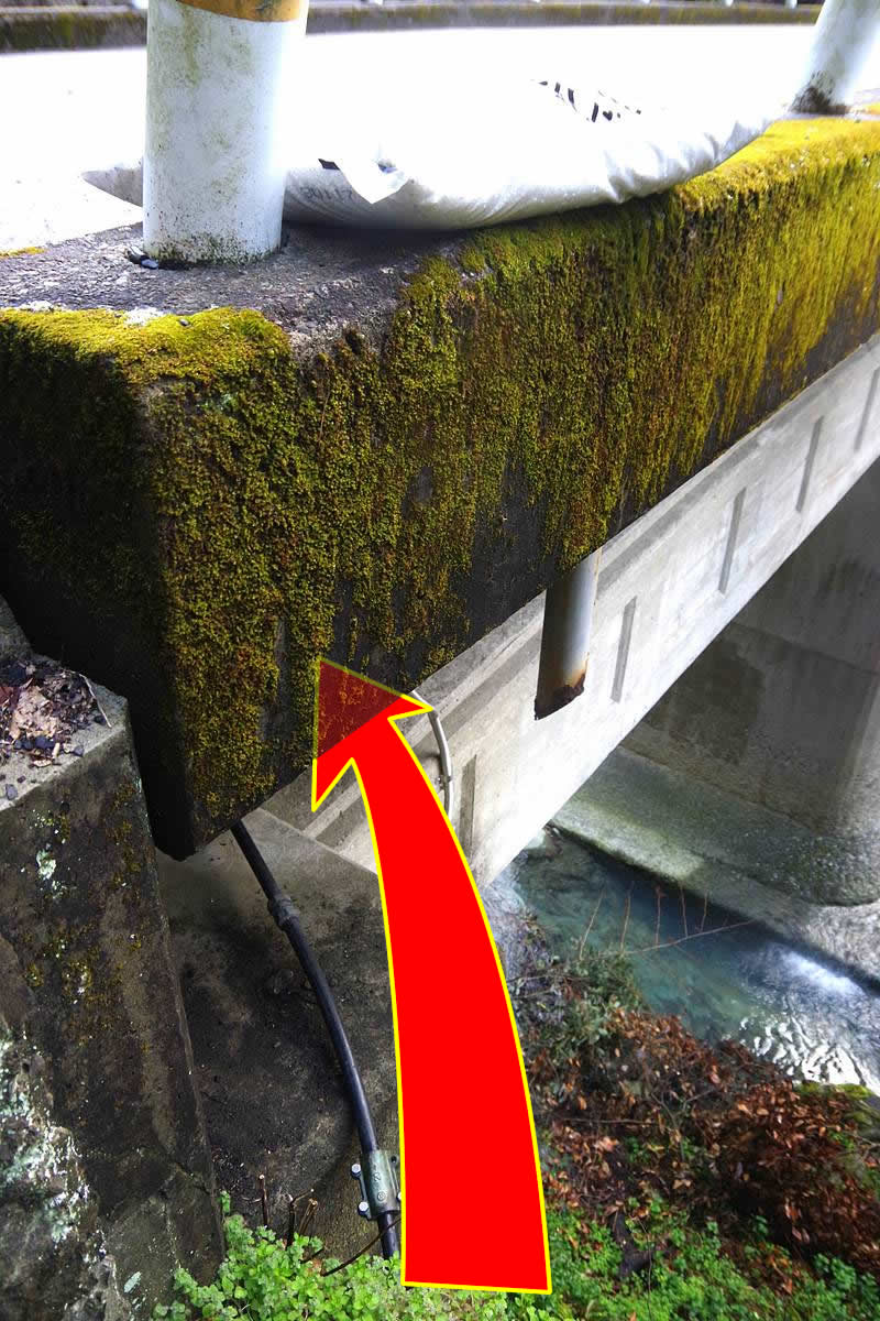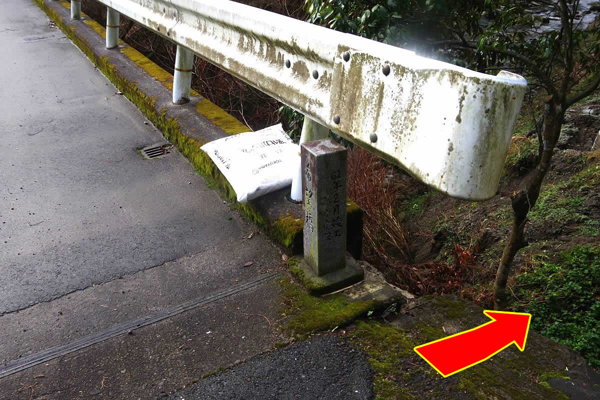 この画像の“赤色の矢印”の位置に古ぼけた石垣があるが、これが旧橋に対応する旧道の路肩であったと思う。