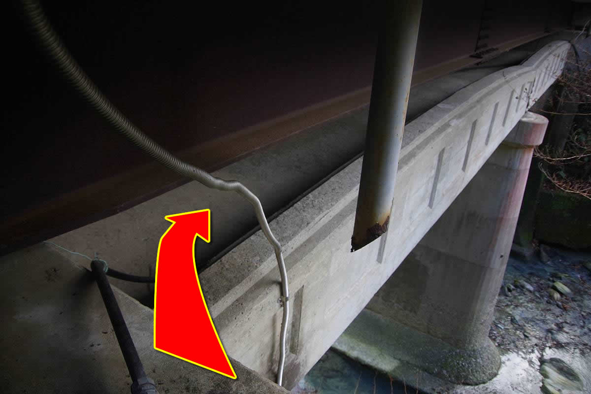 もっとも、そのためにわざわざ旧橋を残したとも思えない。普通は現橋の床下に器具を使って固定するところを、たまたま旧橋がいい位置にあるから、楽にそこを通されている雰囲気。