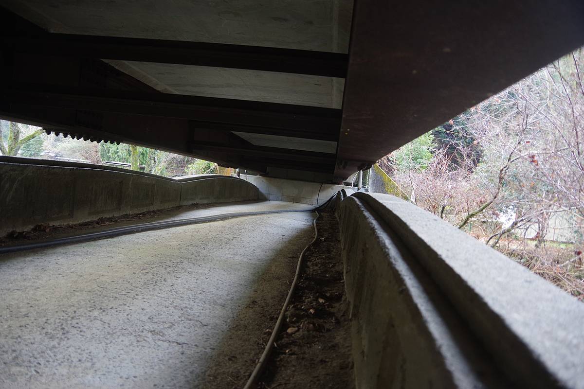 仮に私が子供だったら絶好の秘密基地だと感じる空間だが、そのように使われたらしき置土産は見られない。橋の上は現役さながらに綺麗であった。