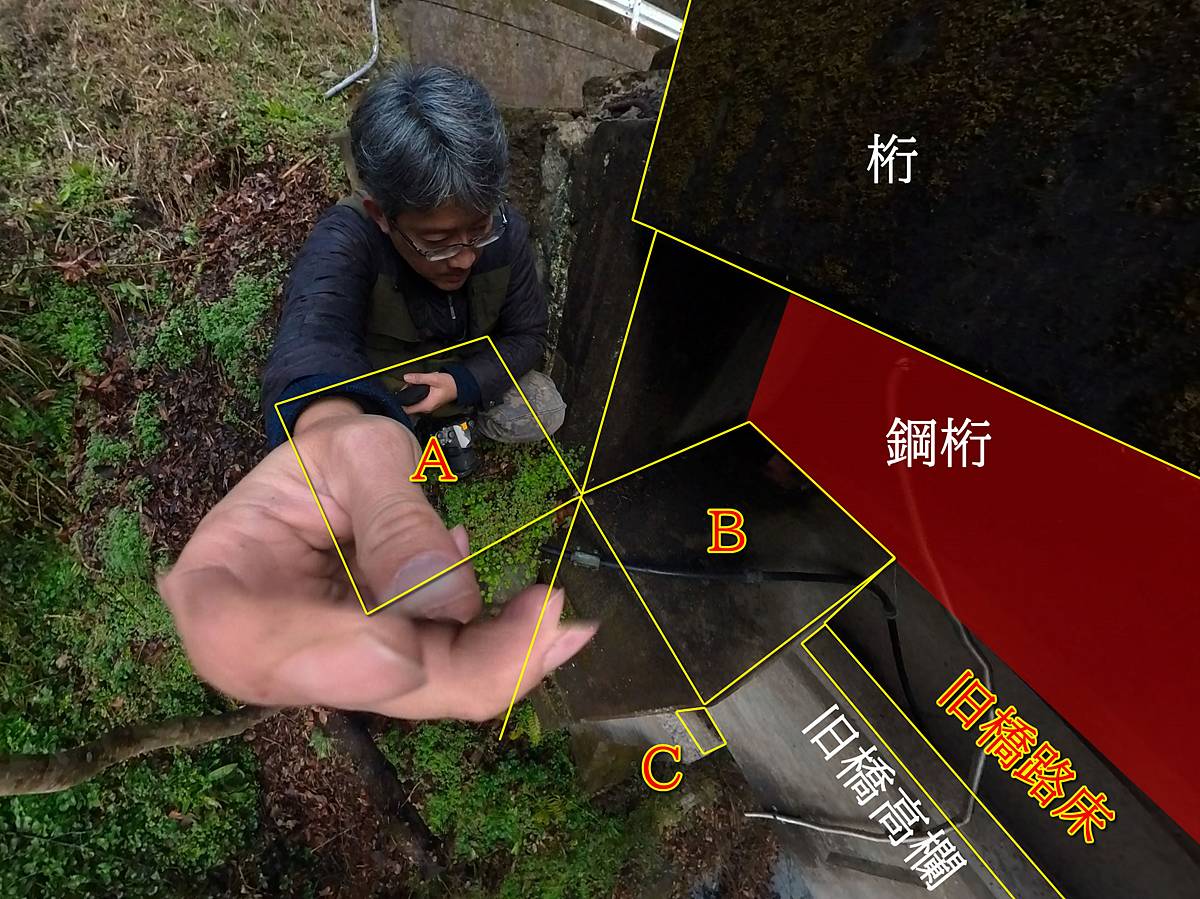 「C」は旧橋橋台の橋座部の切れっ端であり、旧橋最後の通行人にならんとする私に、旧橋の橋台が手助けをしてくれたというのが、エモかった。