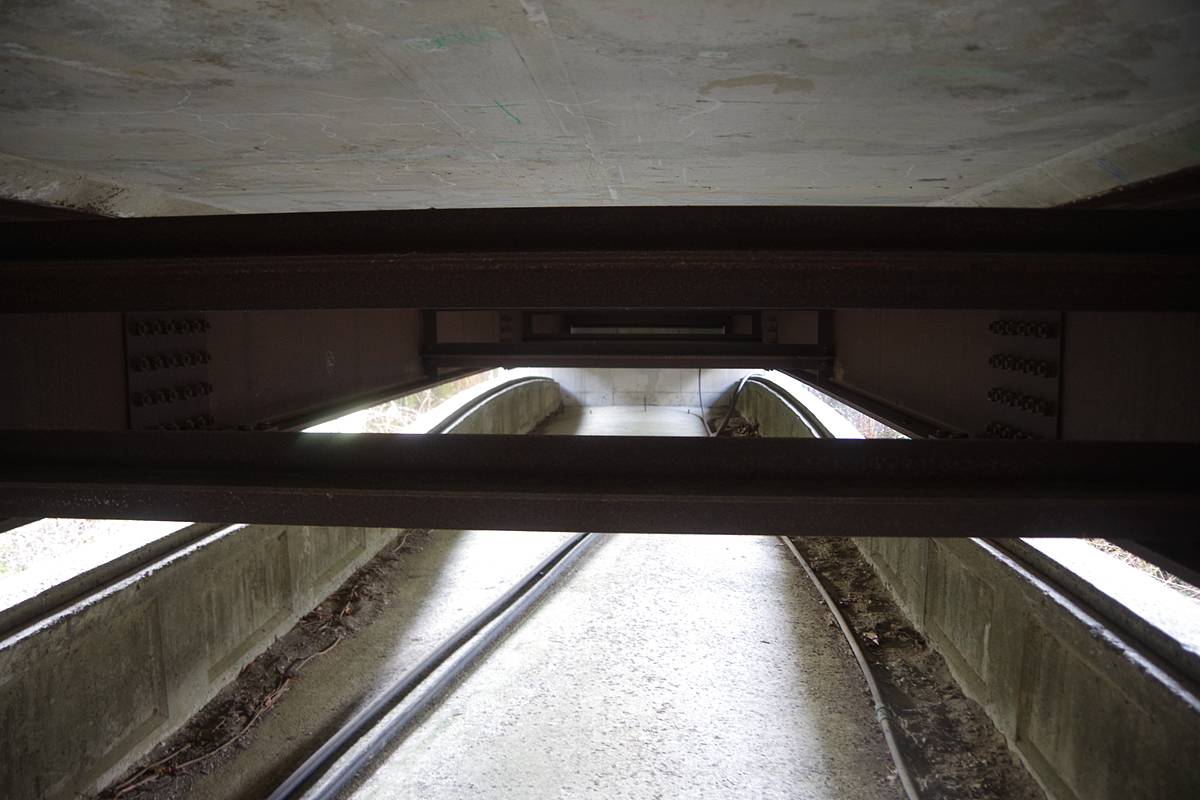 渡ろうとすると、数メートルおきに上の橋の横構が邪魔をしてくる。