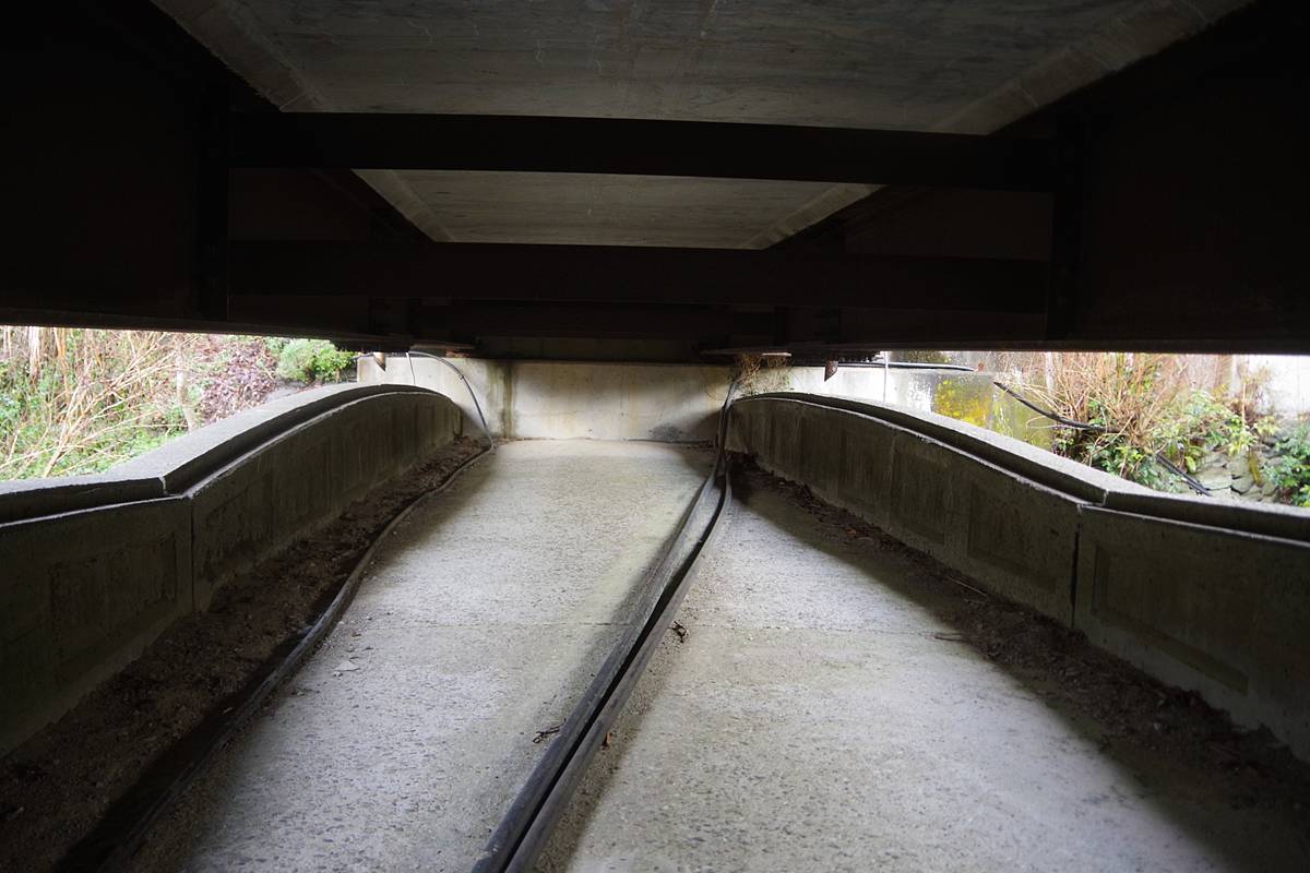 現橋の鋼桁と、旧橋のコンクリート高欄の隙間から、その奥に見えている旧橋路面に潜り込む。