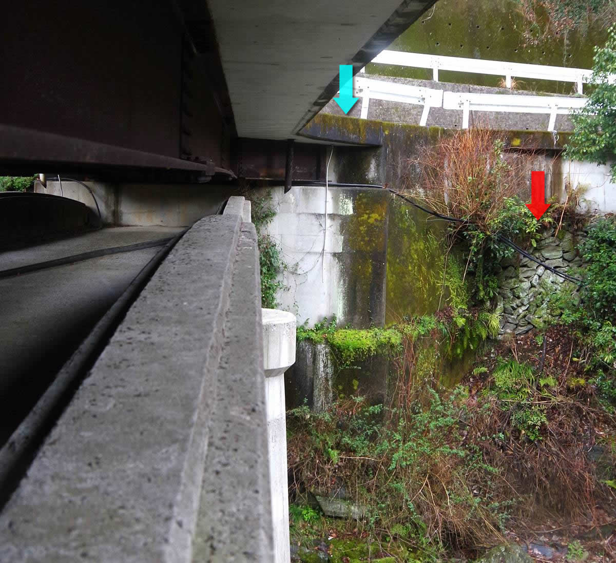 まずは、高欄の手前から橋台脇の地面に降りる。