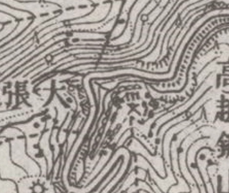 また、昭和40年代以前の旧地形図を見ると(右図は昭和9(1934)年の地形図)、周辺に鉱山記号が複数見え、高越鉱山(こうつこうざん)の注記があった。