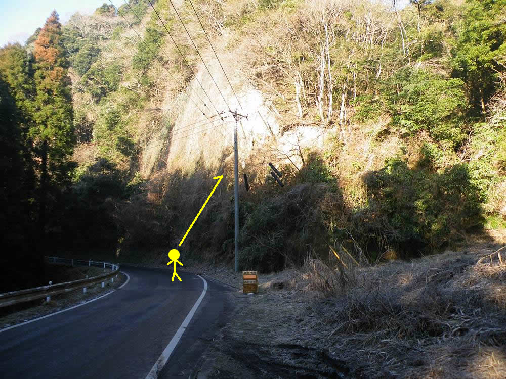 黄和田畑部落の民家を外れて直ぐに三辻に出る。真直ぐに行くのは天津街道であって、左に入っていく一寸広い道は朝生原方面の養老川沿いの村落に至るものである。此処で左に折れて進む。この辺りから東南方には茅戸の山腹を距てて、中腹一帯が針葉樹林に覆われた石尊山を見る。窪地沿いの道で左に大福山から降って来る径を合わせて崖を過ぎると、隧道に出る。石尊山へはこの隧道入口の右手前についている径をとるのである。真直ぐに隧道を潜って行けば筒森部落を経て、小田代、朝生原に至るものである。(以下略)